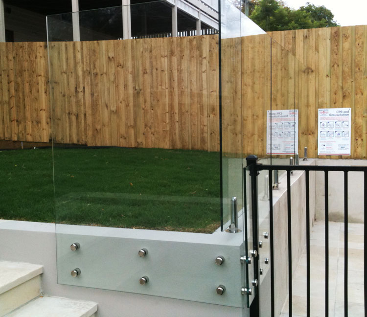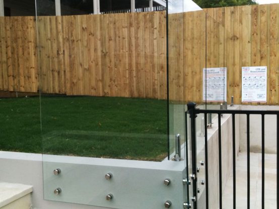 Custom aluminium pedestrian pool gate and frame-less glass fencing the other side of the post.