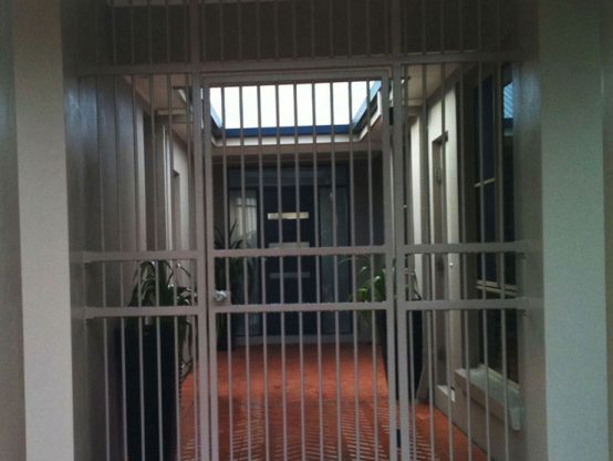 Security gate and fenced enclosure.