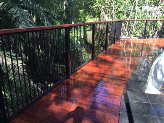 Glass pool fencing panels fitted to a raised deck.